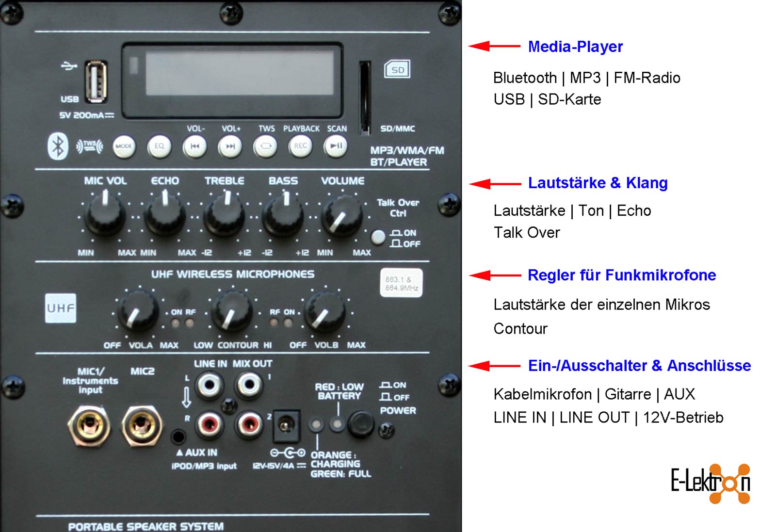E-Lektron EL38-M MK-III 900W- Media-Player, Akku, 2 Funkmikrofone, Bluetooth & Radio